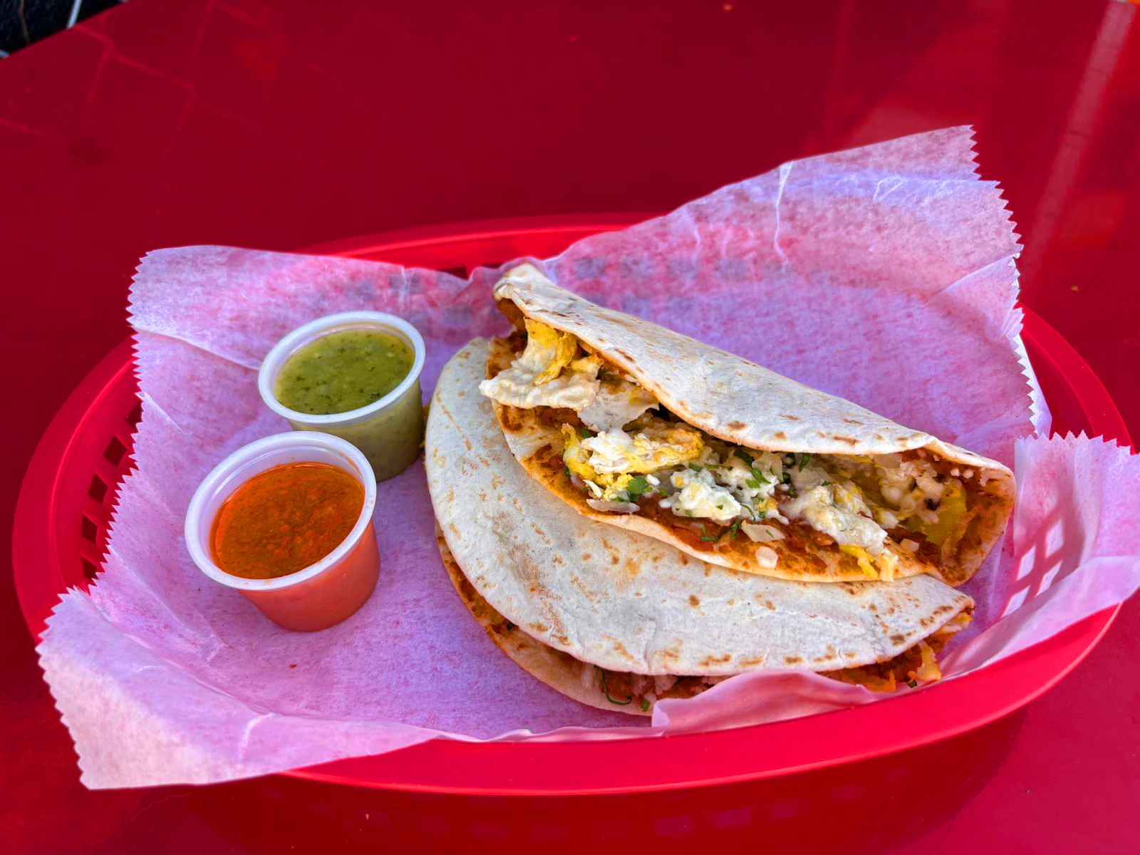 All breakfast tacos are served in 2 flour tortillas accompanied by garlic allioli.