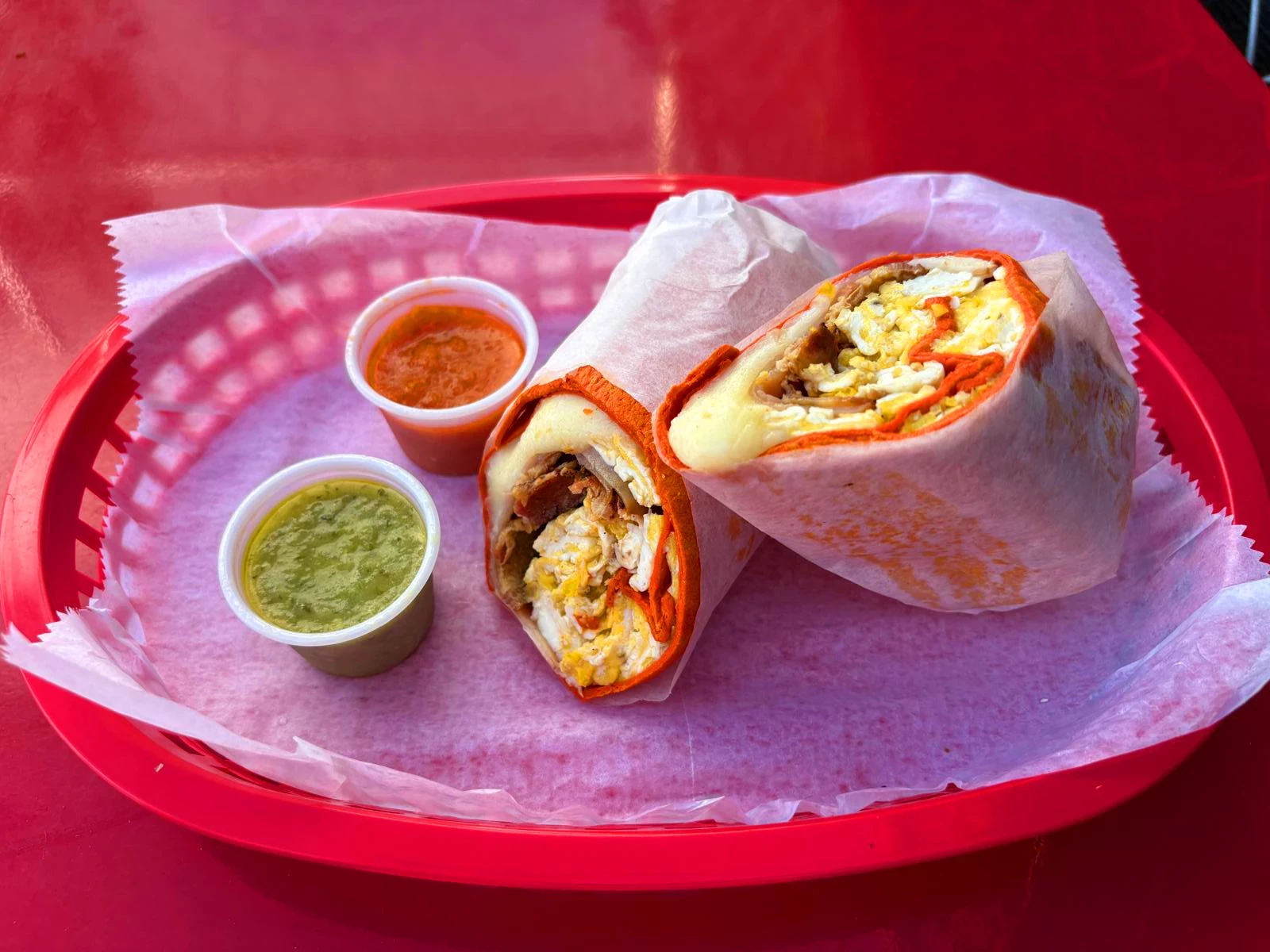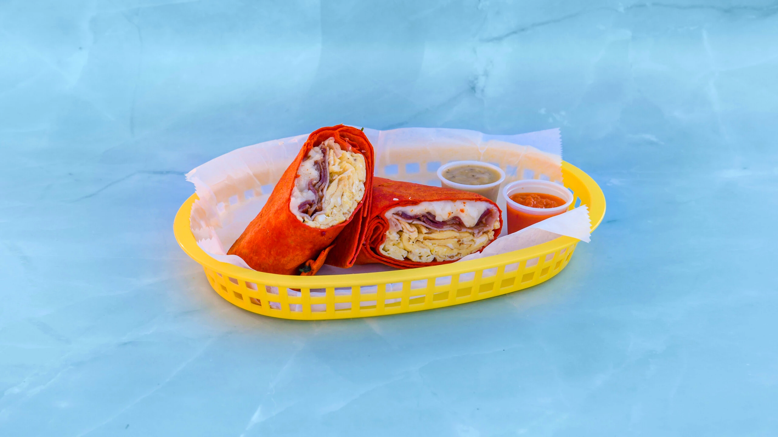 All breakfast burritos are served in a large flour tortilla accompanied by garlic aliioli