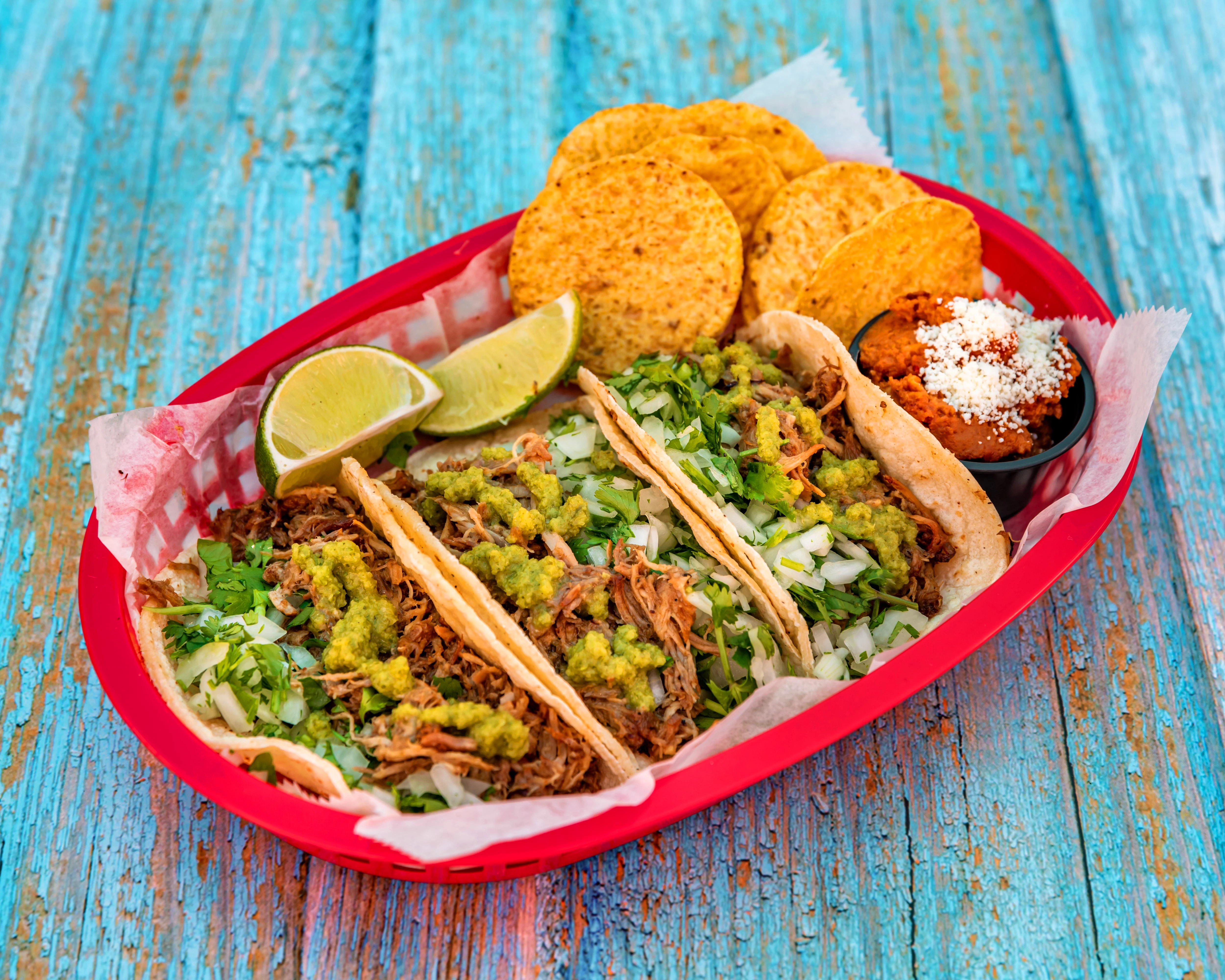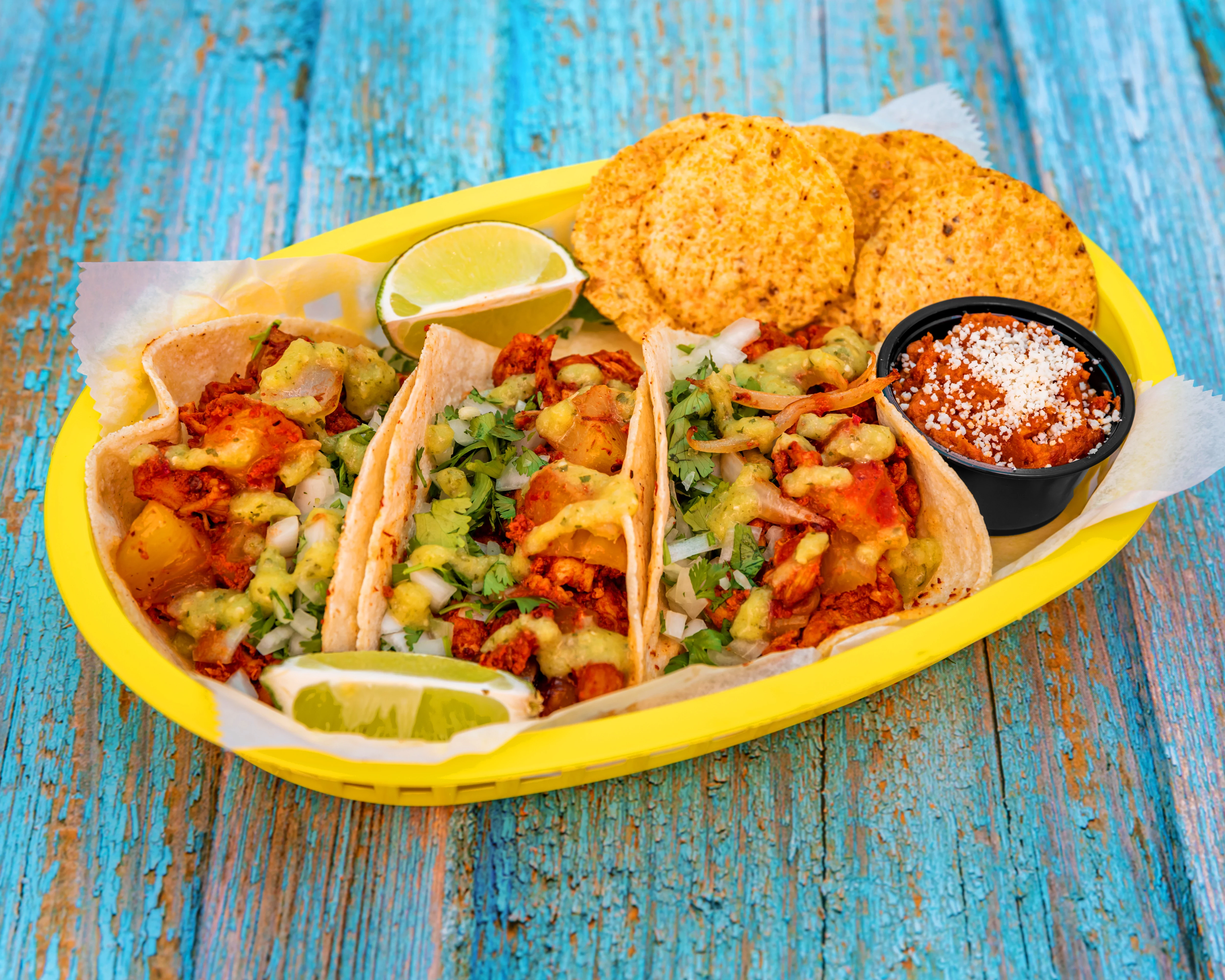 3 tacos in corn tortilla or 2 tacos in flour tortilla served with the same amount of protein, all tacos are served with onion & cilantro and a side of refried pinto beans with chorizo (chips included)