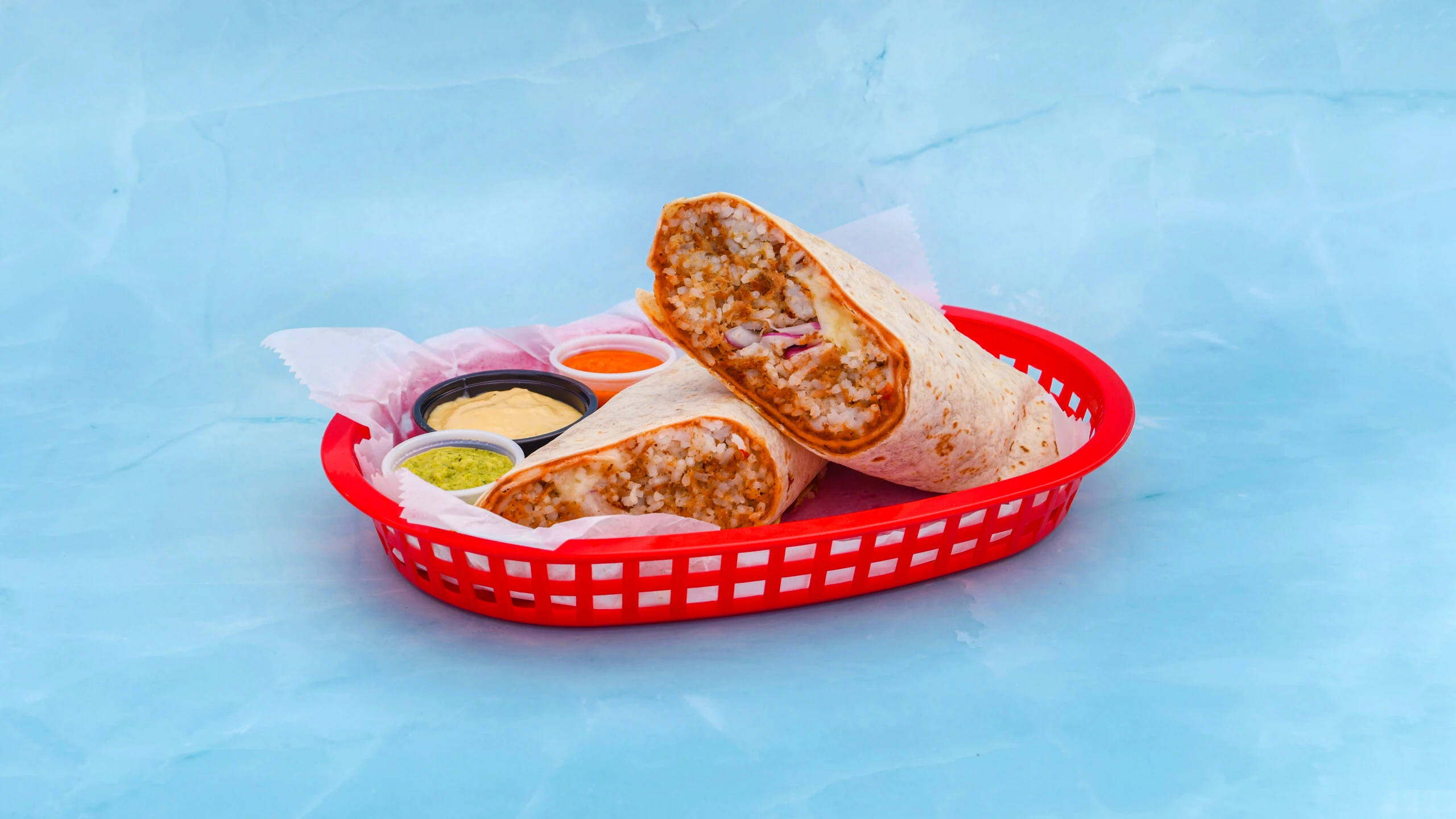 Chicken pastor burritos are served a large flour tortilla with mozzarella chese , white rice , refried pinto beans with chorizo , onion , and cilantro , accompanied by garlic aioli